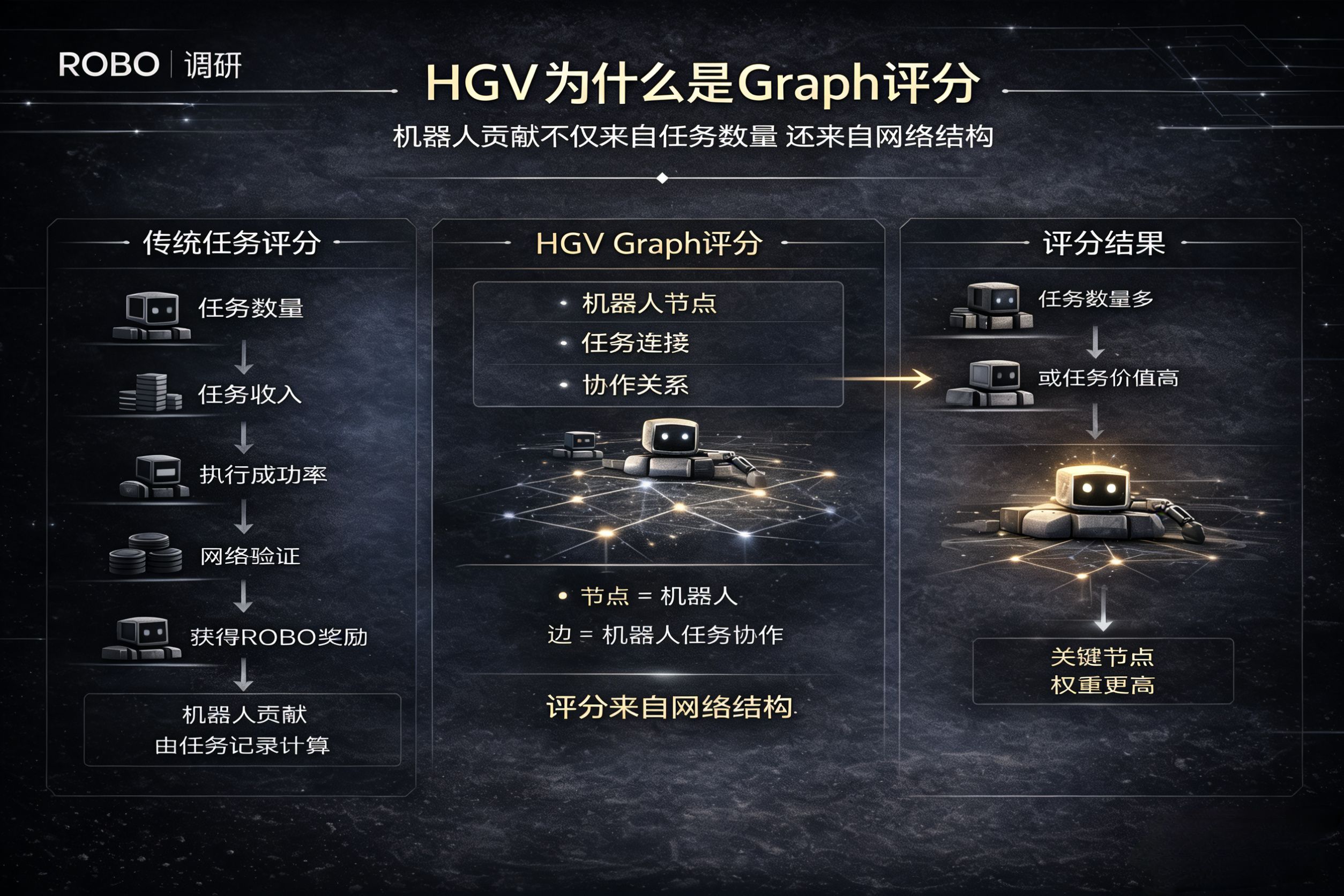 仔细看HGV好像可能会解决这个问题,因为一旦评分变成图结构,它看的就不只是干了多少活,还会看在任务网络里的位置。所以说一个机器人HGV高,要么它真的很勤奋接单多跑活多赚 ROBO多,要么它经常出现在任务链里的关键环节,任务价值很高。