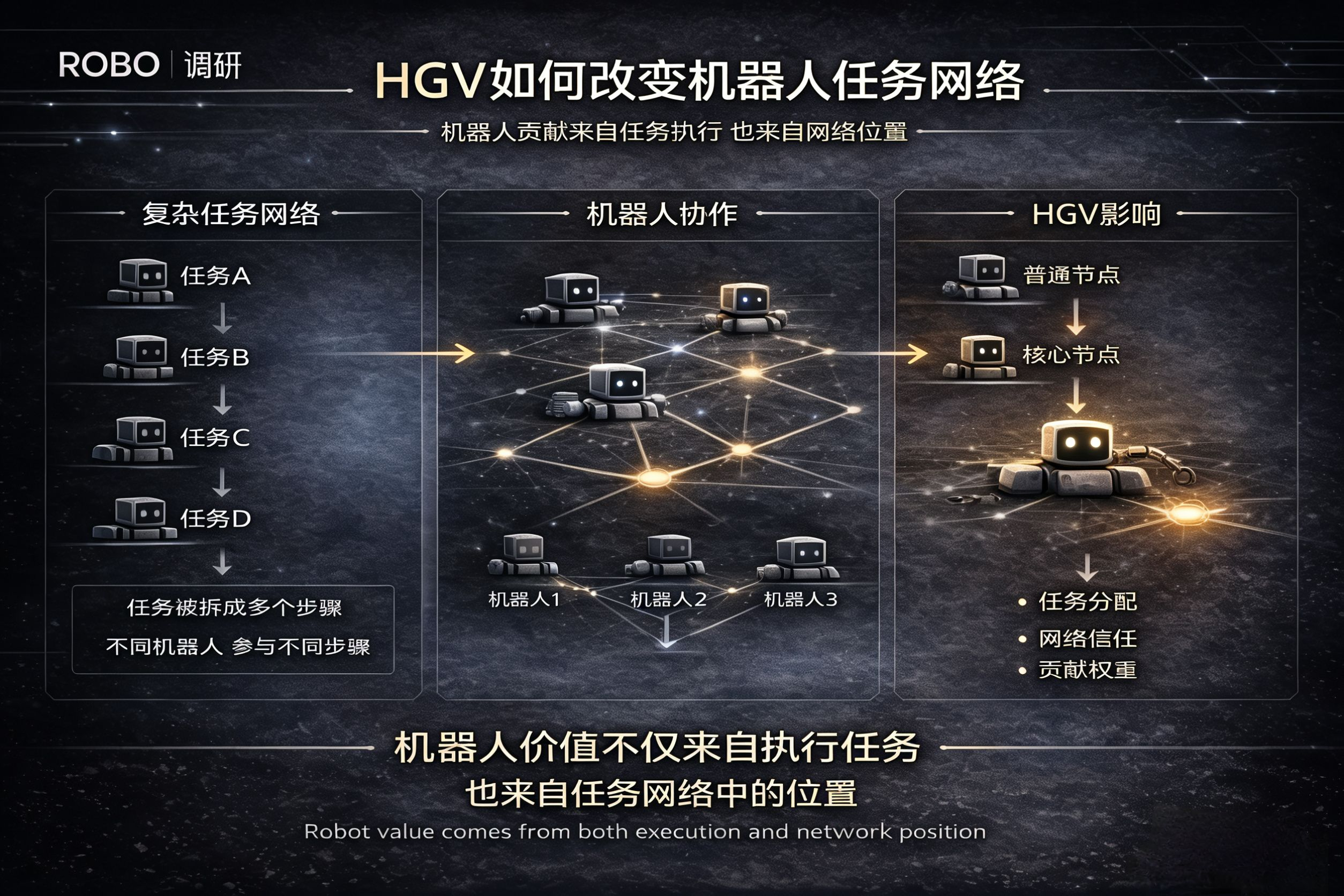 HGV的作用其实就是把这些高价值做任务的节点识别出来,用ROBO代币作为这个系统的经济结算层。如果把整个Fabric网络想成一个外卖接单互助平台,那 HGV其实有点像一个信誉权重。机器人接单、跑活、提交执行记录之后,系统不仅要确认任务是否完成,还要判断这个节点在网络里的可靠程度。因为在 ROBO 的设计里,机器人并不是简单执行任务的工具,它们更像是一个个网络驿站,需要质押、接单、结算、再参与下一轮协作。