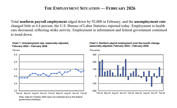 具体来说,2月就业报告显示,在1月新增12.6万个岗位后,2月非农就业反而减少9.2万个,失业率从4.3%升至4.4%。