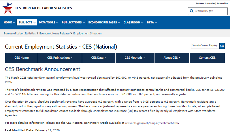 更为关键的是基准数据的修正,美国劳工统计局(BLS)确定修正2025年3月的非农就业人数被高估了86.2万个岗位,并将全年非农就业总人数的变化也从58.4万大幅下修至18.1万。