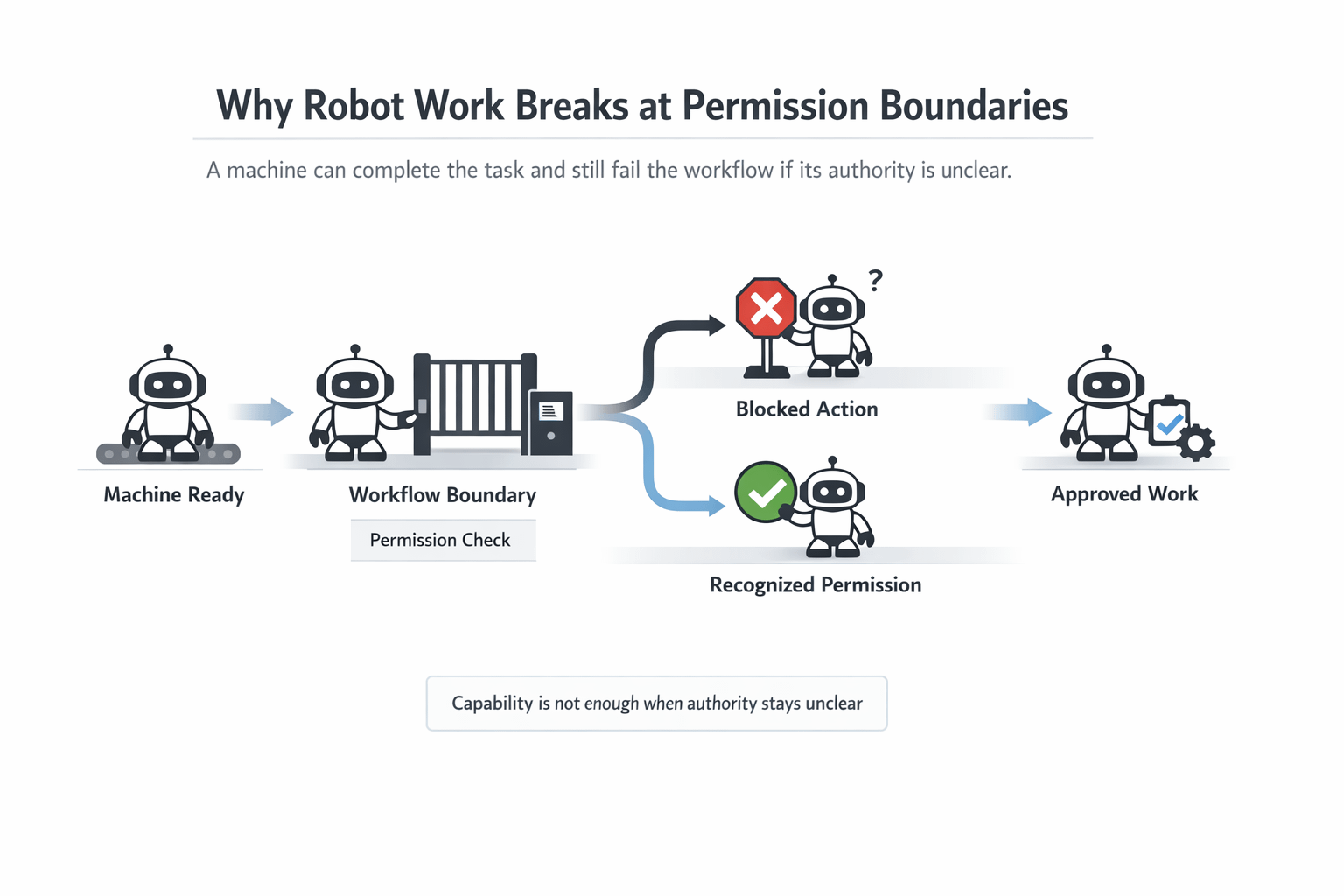 A robot can be capable of doing the job. It does not imply that it has the prerogative to get into the workflow surrounding the task. Can it access the location. Can it trigger the service. Can it settle the action. Will another player have faith in the boundary it is operating within. Does the machine have the known permissions of more than one private system to execute, or must all still be hand wrapped, hand approved, and hand interpreted.
