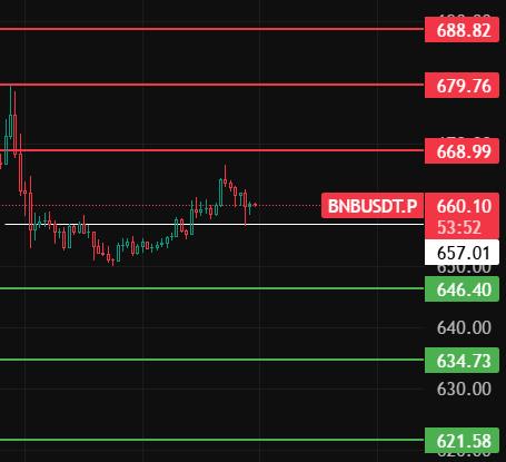 Jika malam hari menembus posisi 657, maka level 1-2 jam mulai melakukan koreksi, jika turun, perhatikan level support di sekitar 646-634-621!#BNB走势