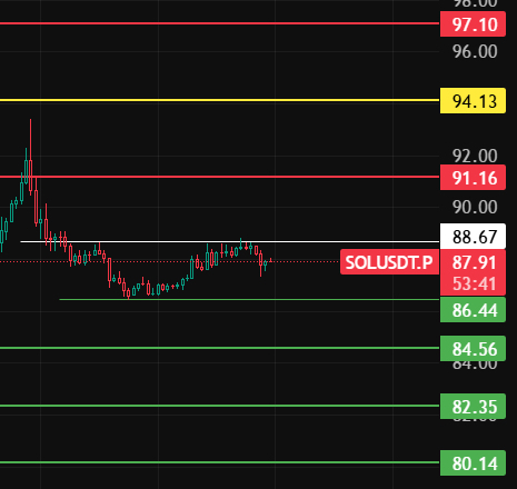Jika malam hari tidak bisa ditutup di atas 88, maka pasar masih tidak bisa naik, jika turun, perhatikan level support di sekitar 85-82-80!#solana