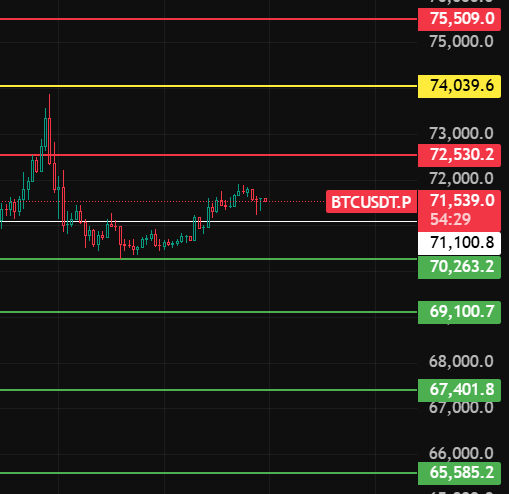 Perhatikan posisi 71100 malam ini, selama tidak menembus posisi ini, maka tren bullish level 1-2 jam masih ada, pasar terus naik, perhatikan level resistance di sekitar 72530-74000-75510!