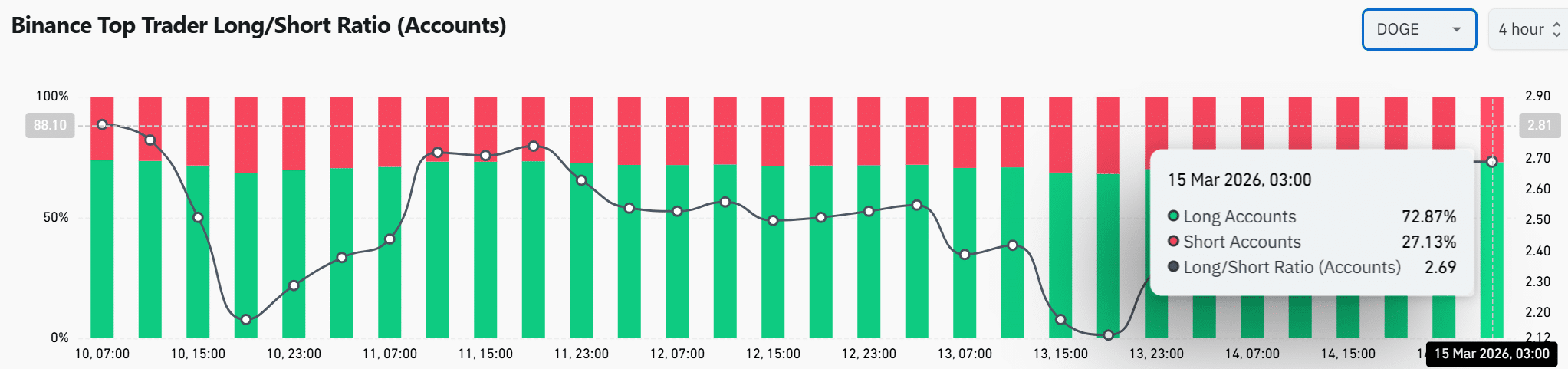 Around 72.87% of top trader accounts held long positions, while shorts accounted for 27.13%. This pushed the Long/Short Ratio to 2.69.