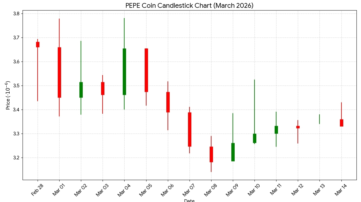 Pada pertengahan Maret 2026, PEPE diperdagangkan dalam kisaran ketat antara $\$0.0000031$ dan $\$0.0000038$. Setelah penurunan bearish di akhir Februari di mana ia turun dari level $\$0.000005$, koin tersebut telah menemukan lantai sementara. Pasar saat ini ditandai dengan pergerakan menyamping dan volume perdagangan yang menurun, mengindikasikan pendekatan "tunggu dan lihat" dari investor ritel.