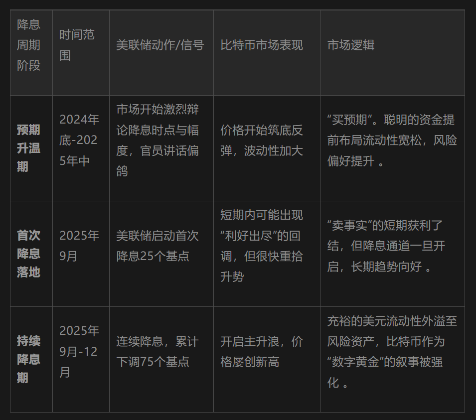 从上表清晰可见,比特币的价格走势与降息预期高度相关,且往往领先于政策的实际落地。在“预期”阶段,市场情绪的推动力甚至强于降息本身。