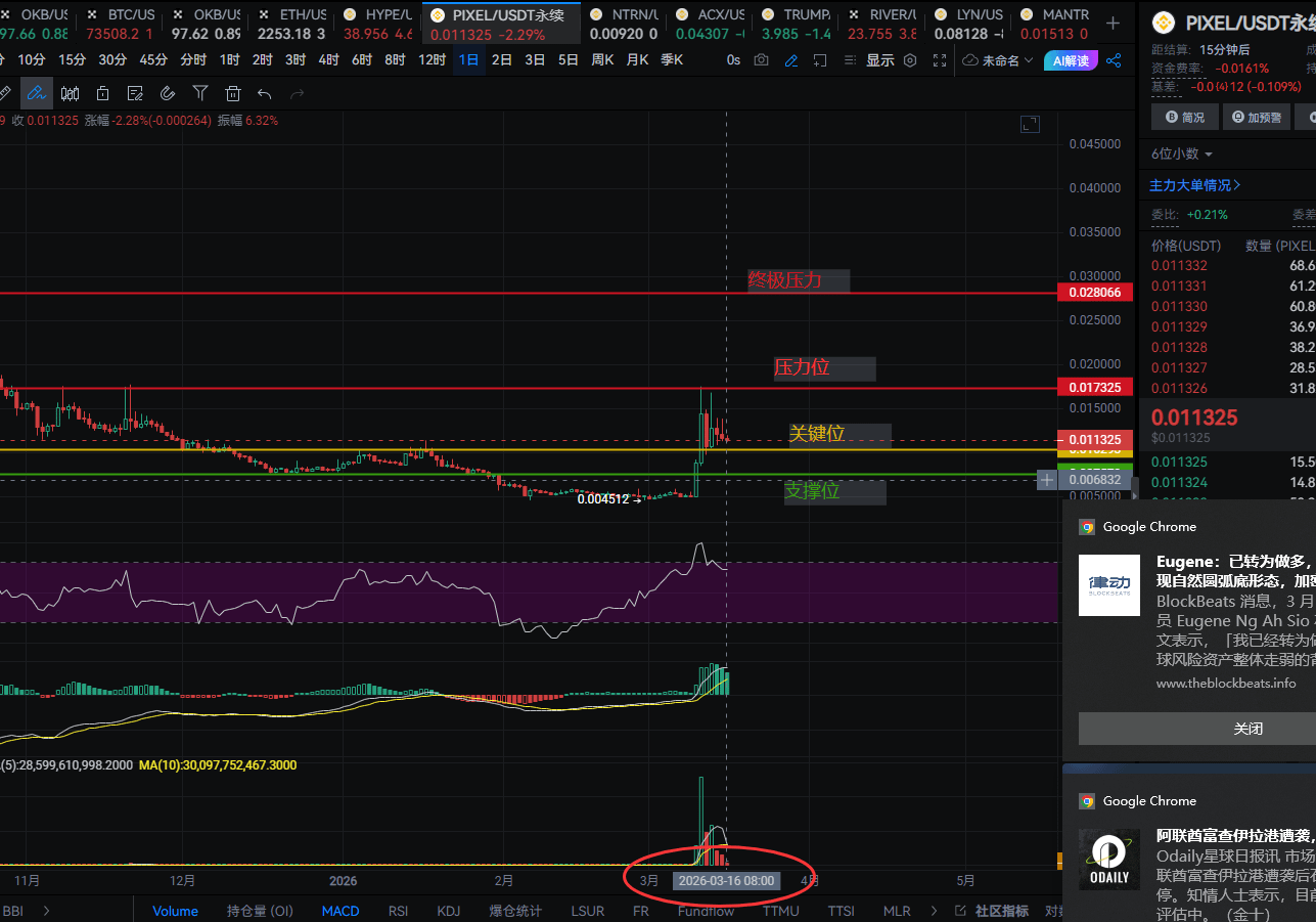 盯了一天PIXEL,现在价格0.0113附近,不上不下的位置最难受。今天我把这张图给兄弟们讲透——关键位在0.010,下方支撑0.0075,上方压力位0.017,强压力在0.028!现在追高容易挨打,等回踩才是王道!