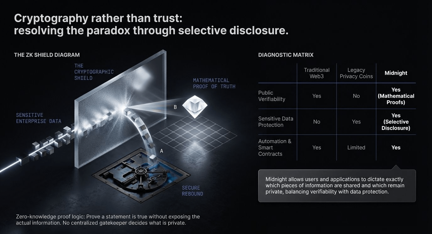 Midnight attempts to answer that question through cryptography rather than trust. No centralized gatekeeper deciding what is private and what is public. Instead, mathematical proofs ensure that conditions are met while the underlying information stays protected. If that model works well at scale, it could become a foundational piece of the next generation of Web3 infrastructure.