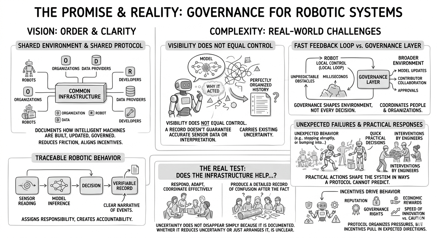 There is also the everyday reality of operating machines in the physical world. Engineers working with real robots often make quick, practical decisions when something behaves unexpectedly. They intervene, adjust parameters, or temporarily override systems to stabilize a situation. Those actions are part of responsible operations, but they do not always fit neatly inside formal governance structures. The more complex the environment becomes, the more these practical responses shape the system in ways that no protocol can fully predict.
