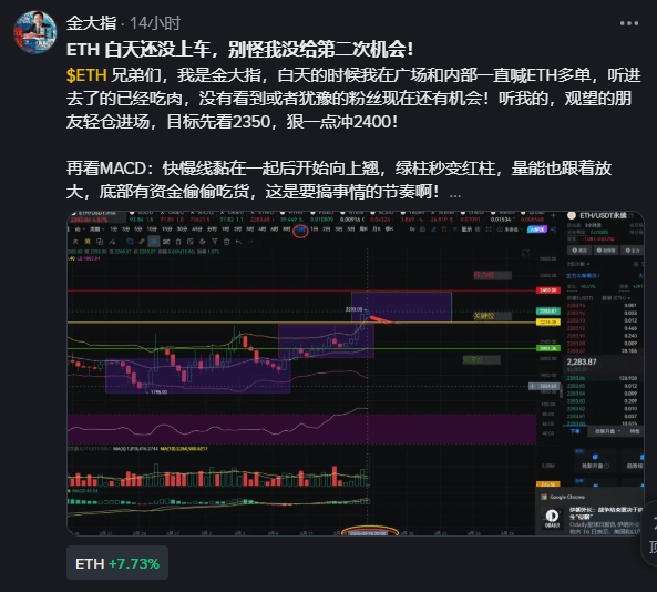 $ETH 昨天我在2180喊多,2280喊多,非常明确的2400附近目标,内部裙是跟上了,但是同步到广场的又有多少人跟上?