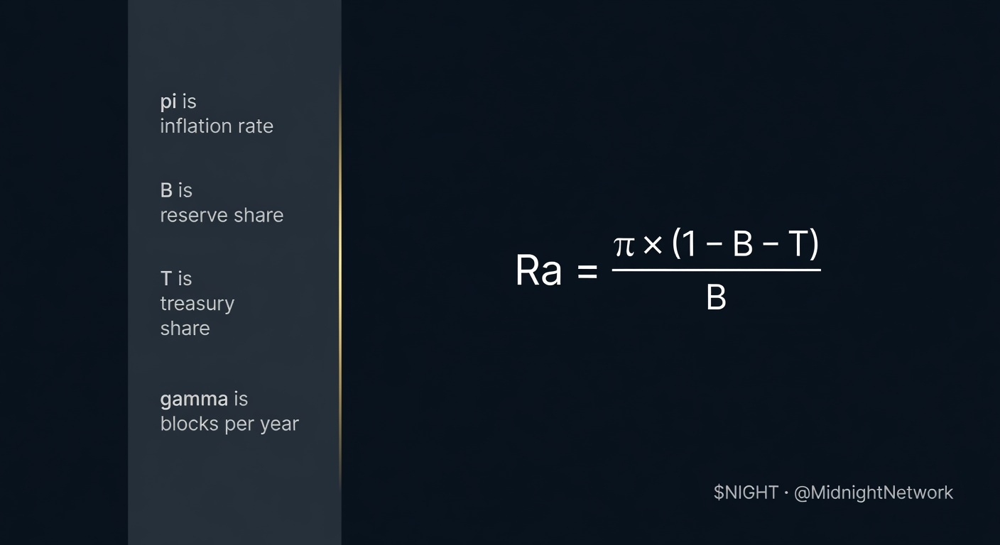 let me break down every variable so nothing is ambiguous. π is the initial annual inflation rate for the circulating supply the whitepaper sets this lower than Ethereum's 5% and Cardano's 7%, close to what economists consider a healthy rate. B is the percentage of total NIGHT supply allocated to the Reserve by the end of token distribution. T is the percentage allocated to the on-chain Treasury. γ is the number of blocks produced in a year which depends on blocktime, expected to fall between 1 and 10 seconds at mainnet launch but not yet finalized.