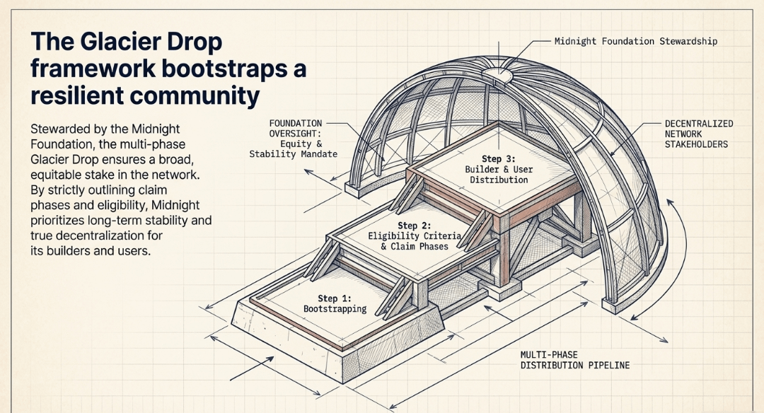 The distribution of NIGHT tokens is managed through a multi-phase framework called Glacier Drop, aimed at bootstrapping a diverse and resilient community.