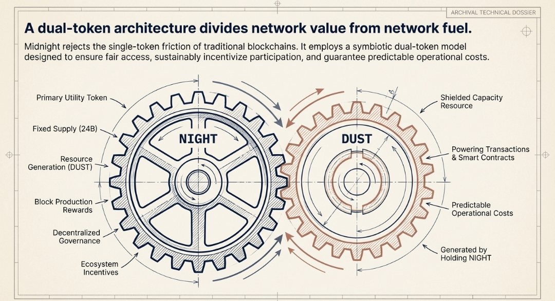 Midnight Network employs a dual-token model consisting of NIGHT and DUST, designed to ensure fair access, incentivize participation, and sustain network operations.