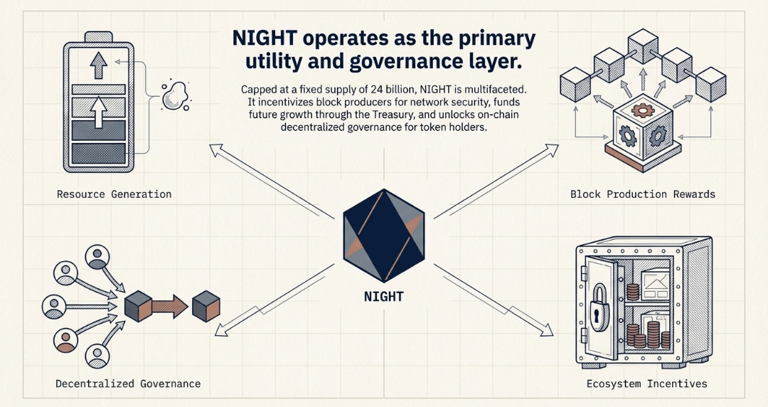 • Resource Generation: Holding NIGHT tokens perpetually generates DUST, the shielded capacity resource essential for powering transactions and smart contract execution on the Midnight network.