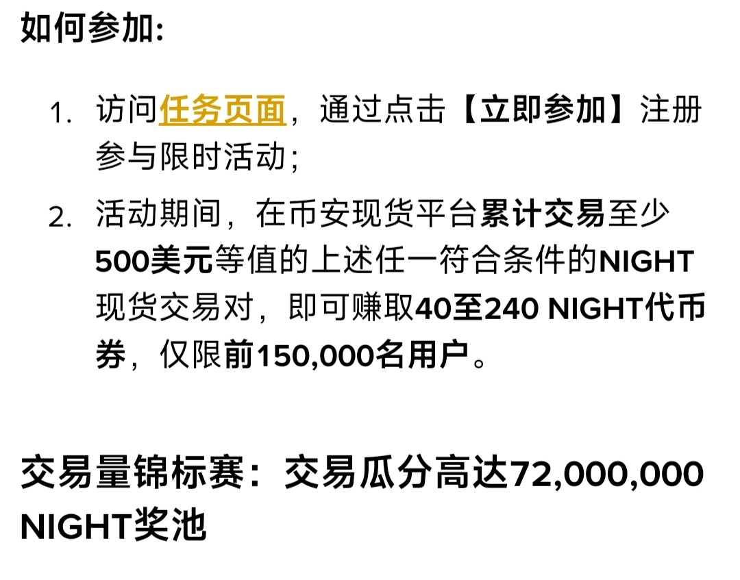 🔷保底:有15万个名额,只需累计交易至少500美元的NIGHT现货交易对,即可赚取40至240 NIGHT代币券,前15万达标就行。
