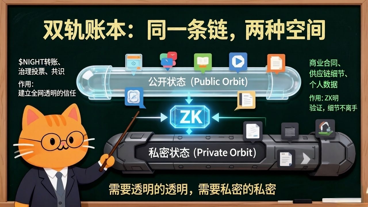 Dalam status publik, yang berjalan adalah transfer token NIGHT, pemungutan suara治理, dan data konsensus—semua ini perlu transparan, karena jaringan harus membangun kepercayaan berdasarkan hal tersebut. Dalam status privat, yang disimpan adalah isi transaksi itu sendiri, menggunakan bukti ZK untuk memverifikasi legalitas. Validator dapat memastikan bahwa transaksi ini sesuai, tetapi tidak dapat melihat isi transaksi.