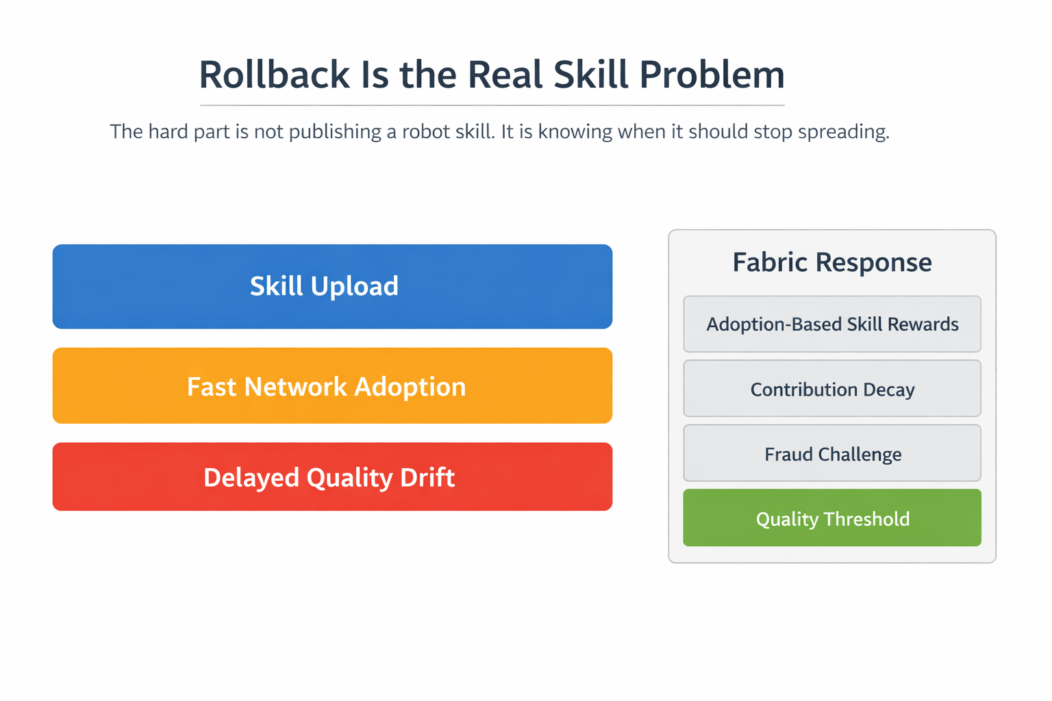It is not the actual danger of teaching a robot a new skill. It is finding out late that the art was diffusing sooner than the faith about it. Fabric continues to revert to modularity-based skill chips that can be added and removed like apps, developers bring in modules that can be utilized by other machines throughout the network. That sounds clean at first. Installation is not the secret fee. It is rollback.