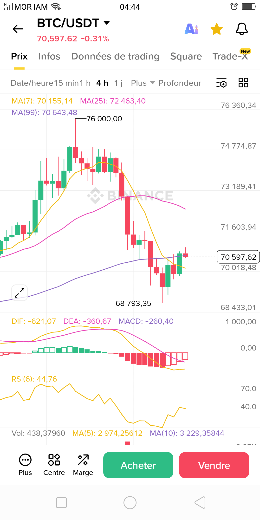 · MA(99): $70,643 → price is trading below this average, confirming hesitation.