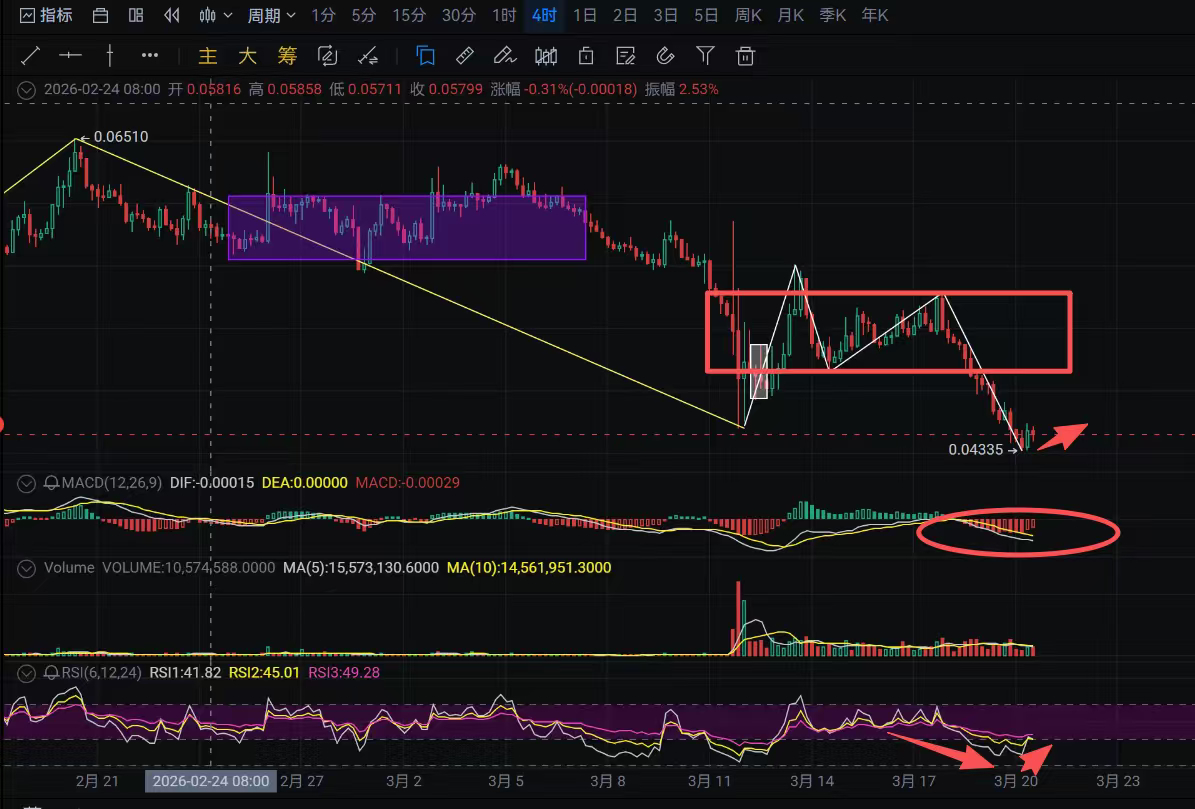 整体趋势:从前期高点 0.06510 开始,整体处于下降通道(黄色斜线),中间经历了一段紫色框的横盘整理(约 0.05-0.058 区间),但最终跌破整理区,延续下行。近期急跌后出现弱反弹,不过反弹未能突破下降趋势线,随后再次回落,当前价格在 0.04335 附近,接近阶段低点,大趋势仍偏空,但要注意4小时在构造底分型,以及大盘企稳随时会反弹一波!这个位置只能等机会!