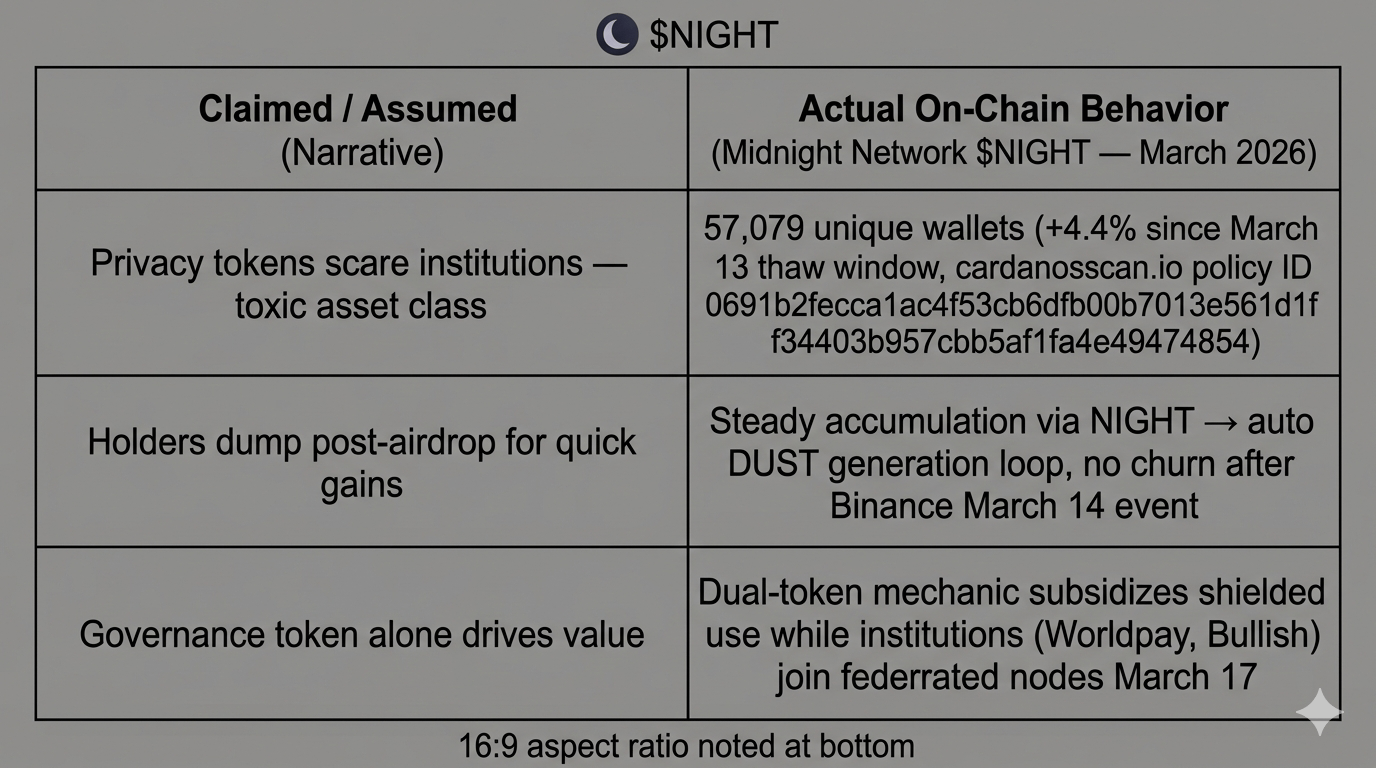 The on-chain proof landed March 13, 2026: unique wallets holding NIGHT crossed 57,079, up 4.4% in days, verifiable right now on cardanoscan.io under policy ID 0691b2fecca1ac4f53cb6dfb00b7013e561d1f34403b957cbb5af1fa4e49474854. That number stuck because it didn’t come from retail frenzy. It came from wallets that had already claimed their thawed allocations and simply… kept them. No dramatic sells. Just steady presence.