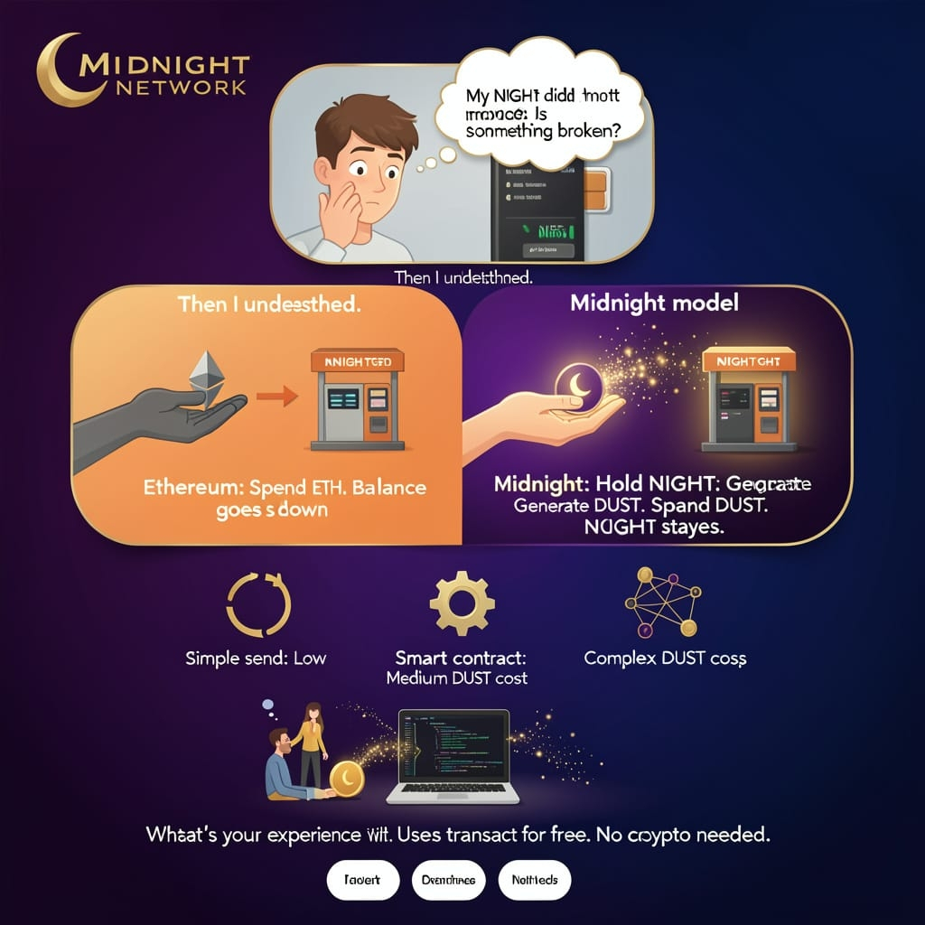 Think of it like this. On Ethereum, you spend ETH. Your balance goes down every time you do anything. On Midnight, you keep your NIGHT. Always. The only thing that moves is the DUST it made while you weren't looking.