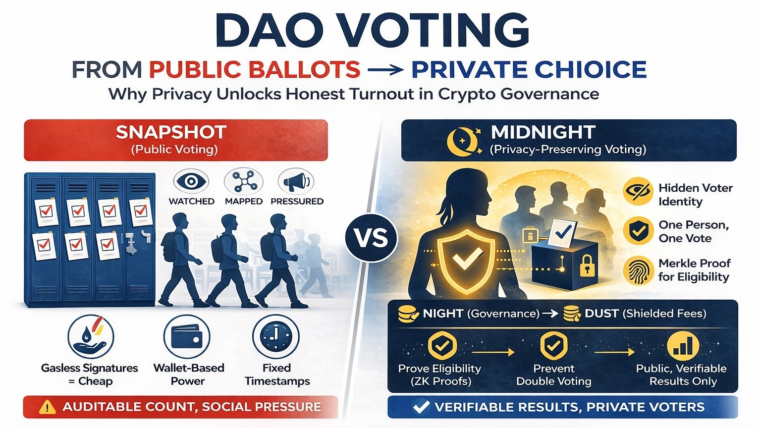 Midnight’s own docs use a civic example for this exact risk. A voter may need to prove they are eligible and have not voted twice, yet exposing identity can open a door to coercion. DAO politics may be softer than state politics, but pressure works the same way.
