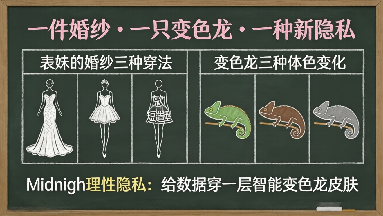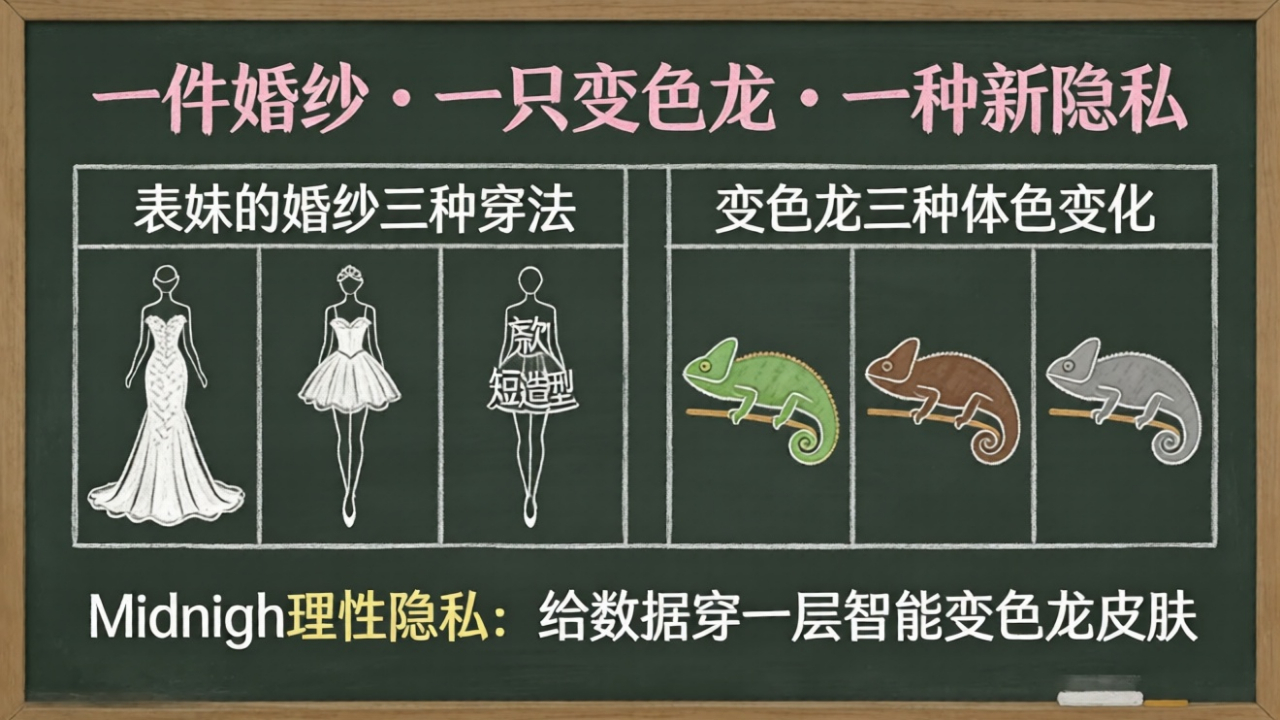 Kemudian saya membaca tentang "Rasionalitas Privasi" dari MidnightNetwork, yang terlintas di pikiran saya adalah kadal itu dan gaun pengantin sepupu saya. Apa yang mereka jual, tampaknya bukan selembar kain hitam yang membuatmu menghilang selamanya, melainkan sepasang kulit chameleon pintar.