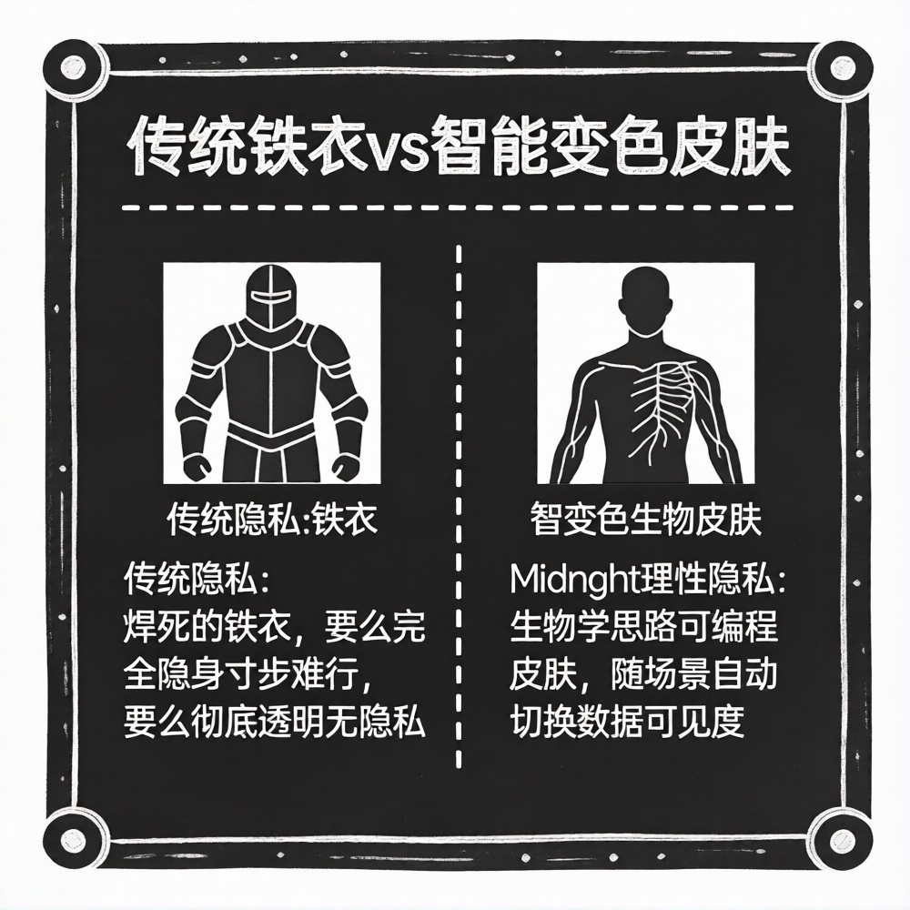 Sebagian besar solusi privasi, seperti baju besi besi yang dipakai dan dilas. Anda bisa selamanya bersembunyi di dalamnya (sepenuhnya anonim, tetapi tidak bisa bergerak), atau sepenuhnya telanjang (sepenuhnya transparan, bisa diperiksa). Pemikiran Midnight lebih dekat dengan biologi: memberikan data Anda lapisan "kulit" yang dapat diprogram dan mampu merasakan lingkungan.