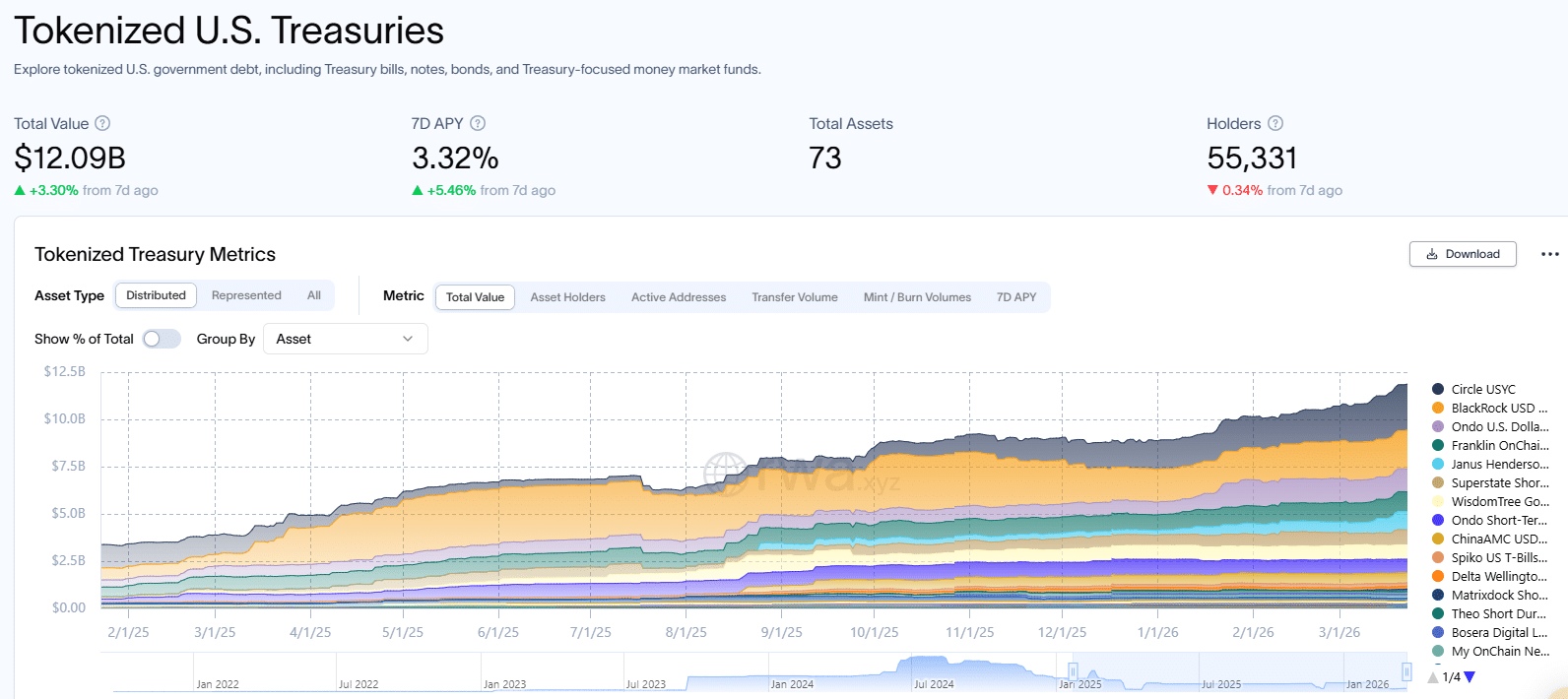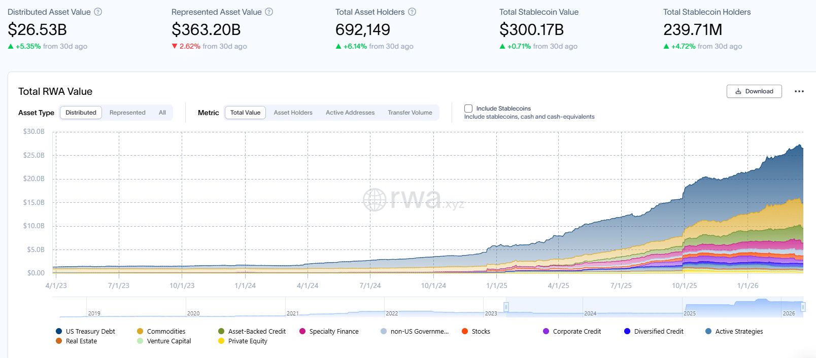 Treasury AS yang ter-tokenisasi telah tumbuh tajam bulan ini, naik sekitar 21% dan menyusun lebih dari 47% dari total nilai RWA. Ini menunjukkan bahwa investor tidak hanya bereaksi terhadap tekanan makro di pasar tradisional. Mereka juga mengekspresikan preferensi tersebut melalui produk keuangan berbasis blockchain. Tokenisasi tidak lagi sekadar kasus penggunaan teoretis. Ini menjadi saluran di mana modal bergerak sebagai respons terhadap kondisi pasar nyata.