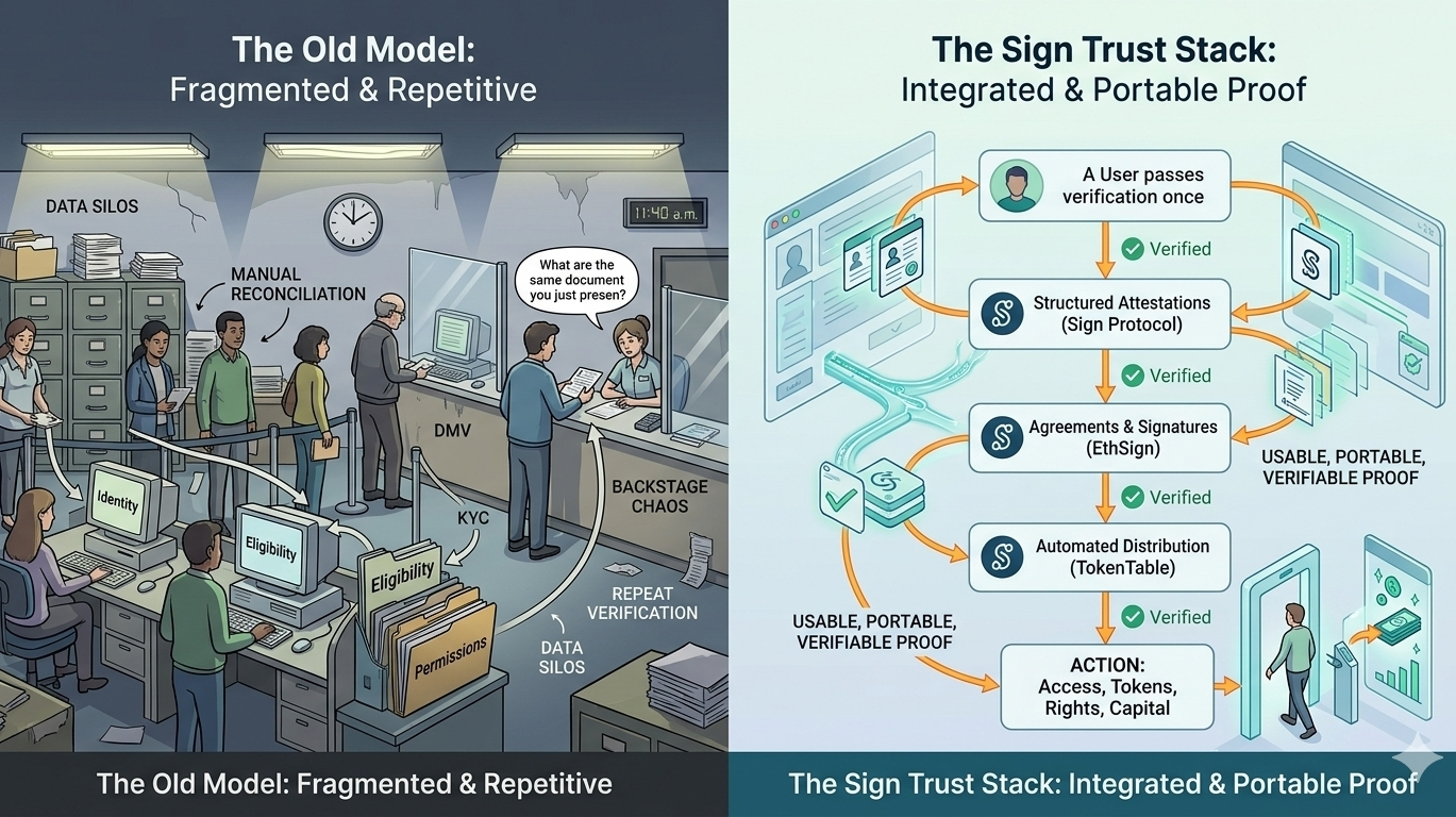 Itulah rasa sakit yang coba diatasi oleh Sign, dan, sejujurnya, itulah yang membuatnya lebih menarik daripada kebisingan Web3 biasa. Tidak secara otomatis bernilai. Tidak secara otomatis dapat diinvestasikan. Tapi lebih menarik. Premis dasarnya cukup sederhana: jika seseorang, dompet, atau organisasi membuktikan sesuatu sekali, bukti itu seharusnya tidak menghilang ke dalam silo; itu harus menjadi dapat digunakan, portabel, dan dapat diverifikasi di seluruh sistem. Dan jika bukti itu penting — jika itu menentukan apakah seseorang mendapatkan token, akses, hak, manfaat, atau modal — maka pengalihan dari verifikasi ke distribusi seharusnya tidak menjadi operasi belakang panggung yang kacau yang dipegang bersama oleh spreadsheet, persetujuan manual, skrip khusus, dan dasbor internal yang setengah terawat. Masalahnya adalah, kekacauan semacam itu telah menjadi begitu normal sehingga orang hampir tidak mempertanyakannya lagi. Mereka hanya membangun di sekelilingnya. Sign adalah salah satu dari sedikit proyek yang secara eksplisit mengatakan bahwa mungkin kekacauan itu sendiri adalah peluang produk.