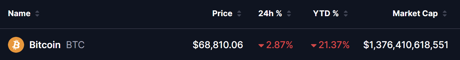 As of March 27, 2026, BTC is trading at $68,810.06, down 2.87% in the past 24 hours and 21.37% year-to-date, with a market capitalization of approximately $1.376 trillion.