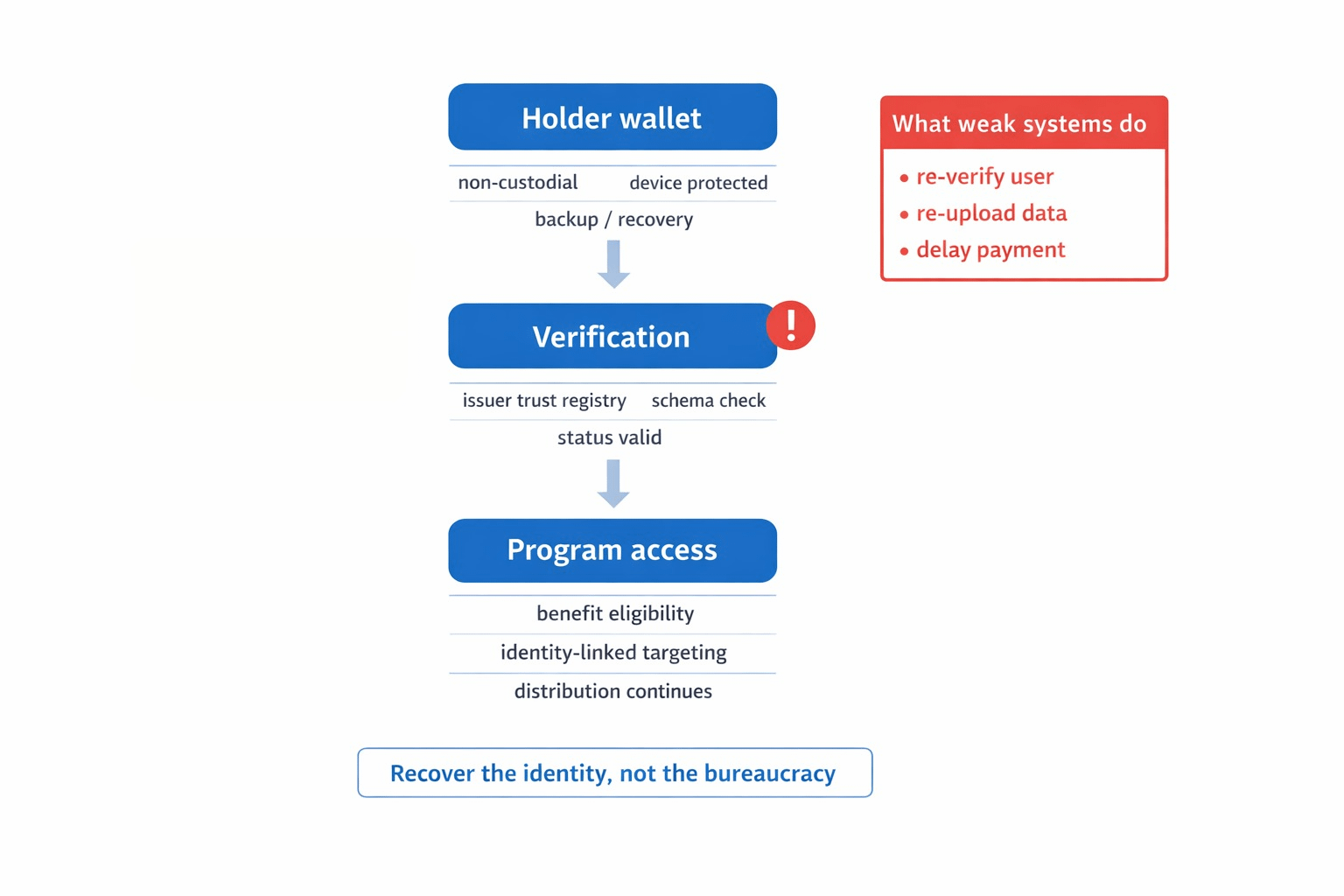 The reason this gets more painful than a normal wallet problem is that SIGN ties identity directly into money and capital flows. Its identity layer is meant to support one citizen and one verifiable identity layer across agencies and regulated operators. On top of that, the capital side uses eligibility evidence to gate access to benefits and subsidies, with identity linked targeting and duplicate prevention built into the distribution logic. In the welfare flow, the system verifies citizens through the ID layer, generates the allocation table, executes distributions, and anchors the ruleset hash and execution references for later review. That means a lost device is not just a login inconvenience. It can become a delayed payment, a blocked subsidy, or a second round of proving the same thing to a system that should already know you passed.