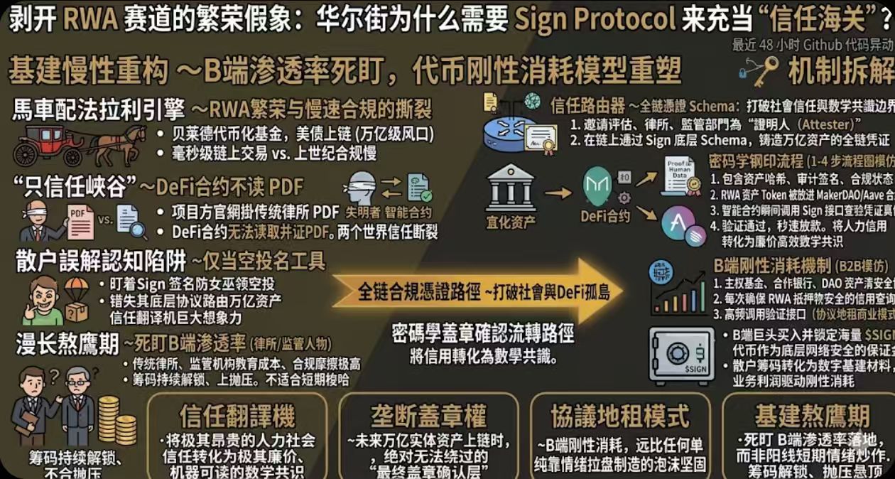 Ini pasti bukan proyek yang bisa ditentukan hidup matinya hanya dengan melihat beberapa garis candlestick. Apa yang perlu kita perhatikan adalah tingkat penetrasi nyata di sisi B—apakah ada protokol RWA terkemuka yang mulai secara paksa meminta bukti verifikasi Sign? Apakah lembaga kepatuhan tradisional benar-benar mulai memberikan dukungan di blockchain melalui Sign?