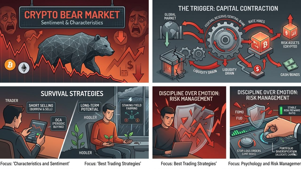 A bearish market in crypto is not merely the result of falling prices. It is a structural phase driven by shifts in liquidity, risk appetite, and collective psychology. Much like bull and alt cycles, bearish markets follow a recognizable pattern where capital retreats, narratives weaken, and confidence erodes across the ecosystem.