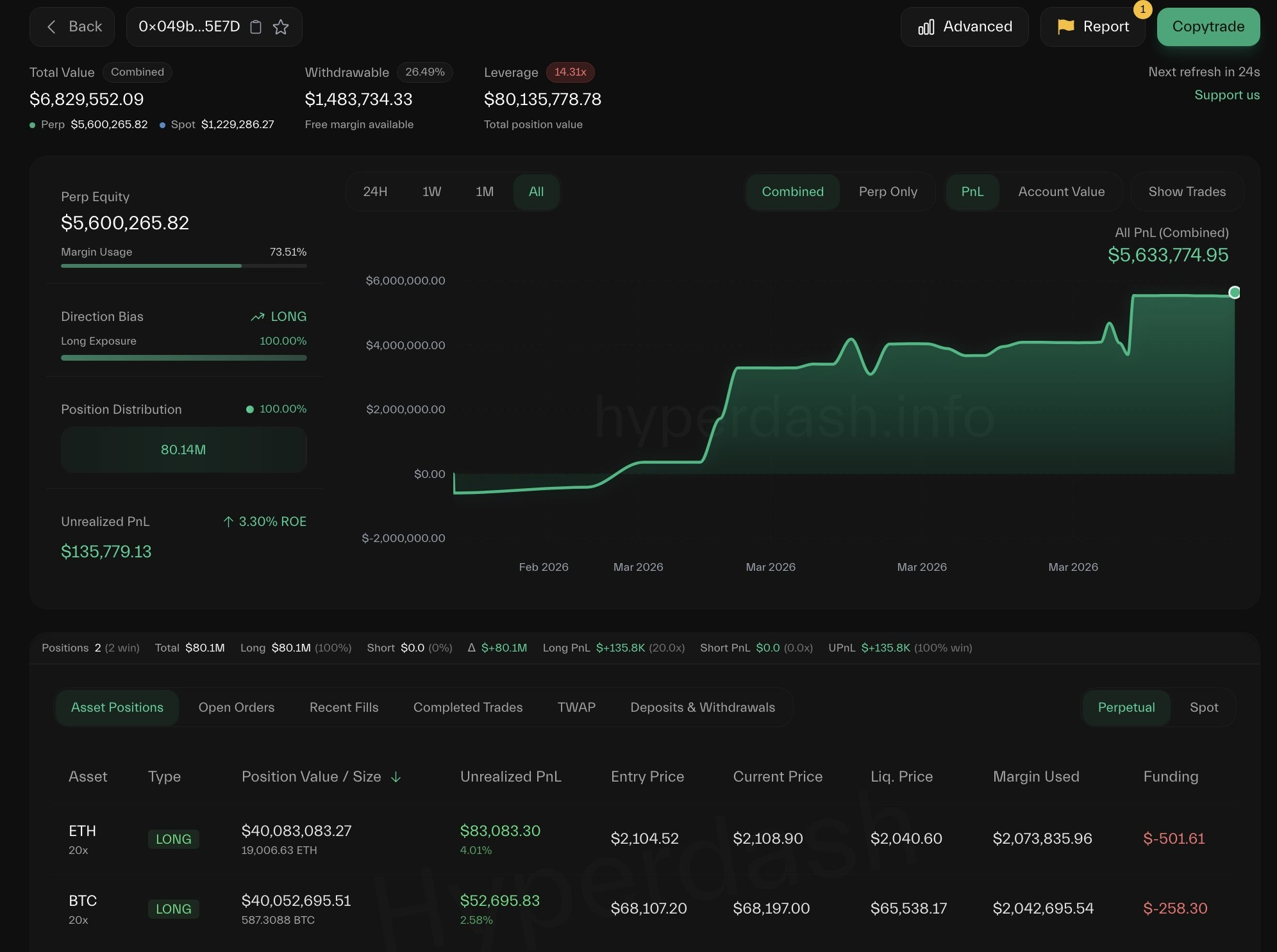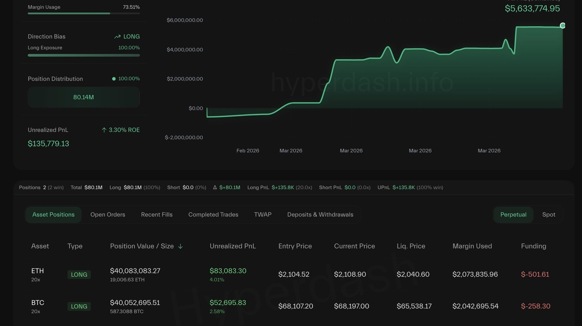 Seorang paus kripto telah membuka posisi panjang dengan leverage 20x pada Bitcoin dan Ethereum, dengan nilai gabungan sekitar $80,13 juta.