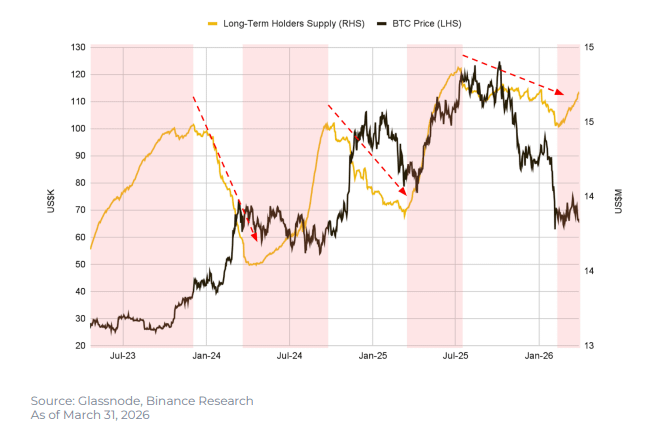 According to Binance Research’s April 2026 Monthly Market Insights, BTC long-term holder supply has been rising since mid-February, with March marking the first positive month of spot ETF flows in 2026 at approximately $1.2 billion. The report frames this confluence as evidence that a market reset is underway, paving the foundation for a new accumulation cycle.