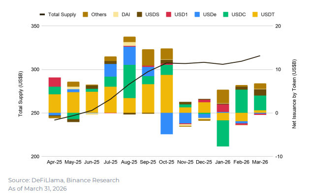 Simultaneously, total stablecoin supply has climbed to a record $315 billion. That capital has not left crypto. It has moved from speculative positions into stable assets; dry powder, waiting for redeployment. Binance Research notes that stablecoin supply hovered around $315 billion in March, up 0.11% month-over-month, even as the U.S. Clarity Act draft triggered short-term disruption in crypto-linked assets.