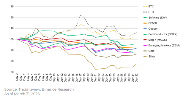 Since the outbreak of the 2026 Middle East conflict, BTC and ETH have returned +1% and +6% respectively from Day 0 to Day 32, peaking at +14% and +22%. Over the same period, the S&P 500 fell 8%, Mag 7 declined 10%, semiconductors dropped 12%, emerging markets lost 13%, while gold and silver plunged 13% and 22%.
