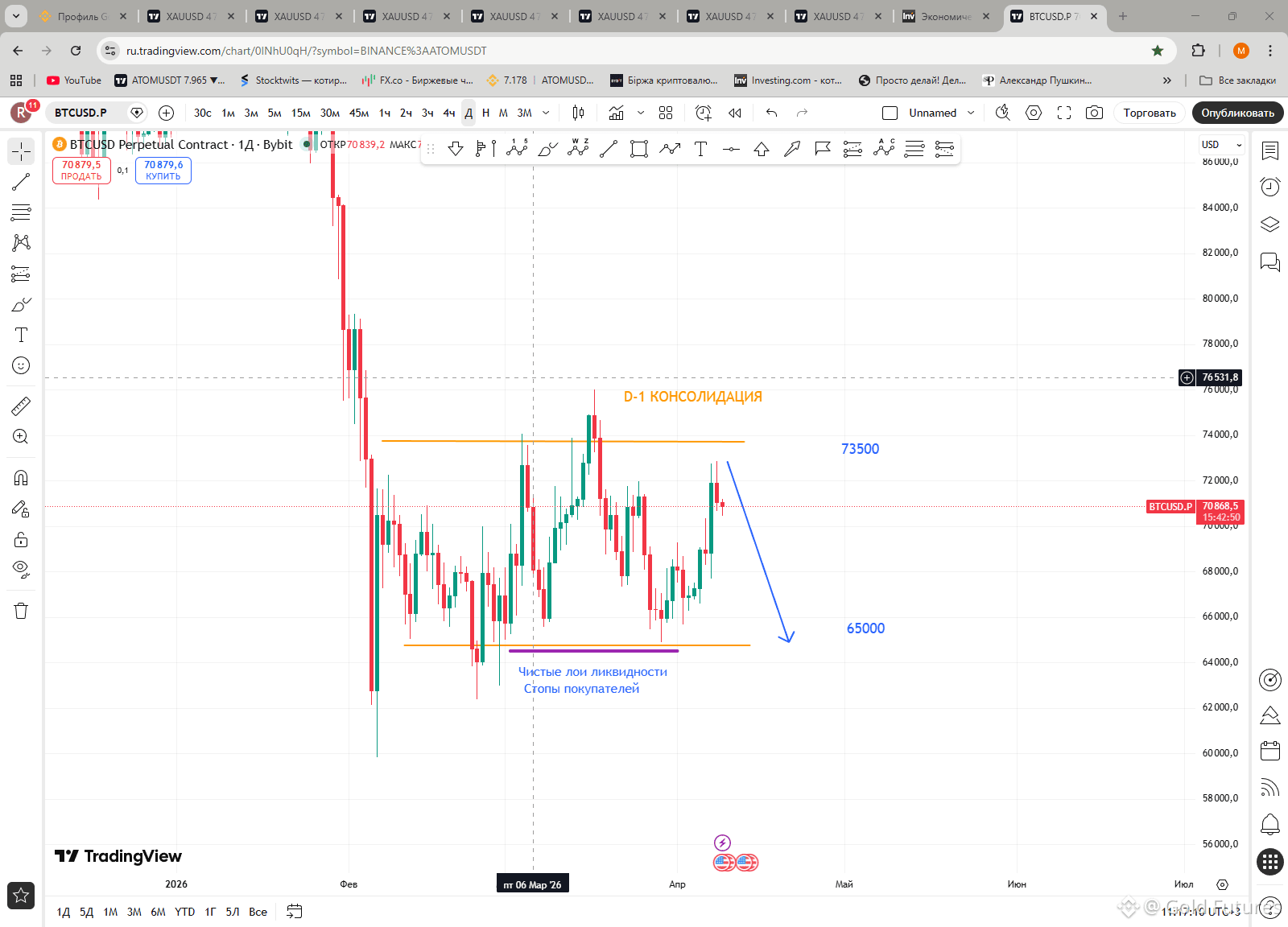 Тестирует хай консолидации и мат-блок. Есть диапазон для похода в шорт к лоям консолидации, также расположен огромный пул ликвидности с чистыми лоями — маркетмейкер будет собирать их. Посмотрим, что покажет рынок!🐳