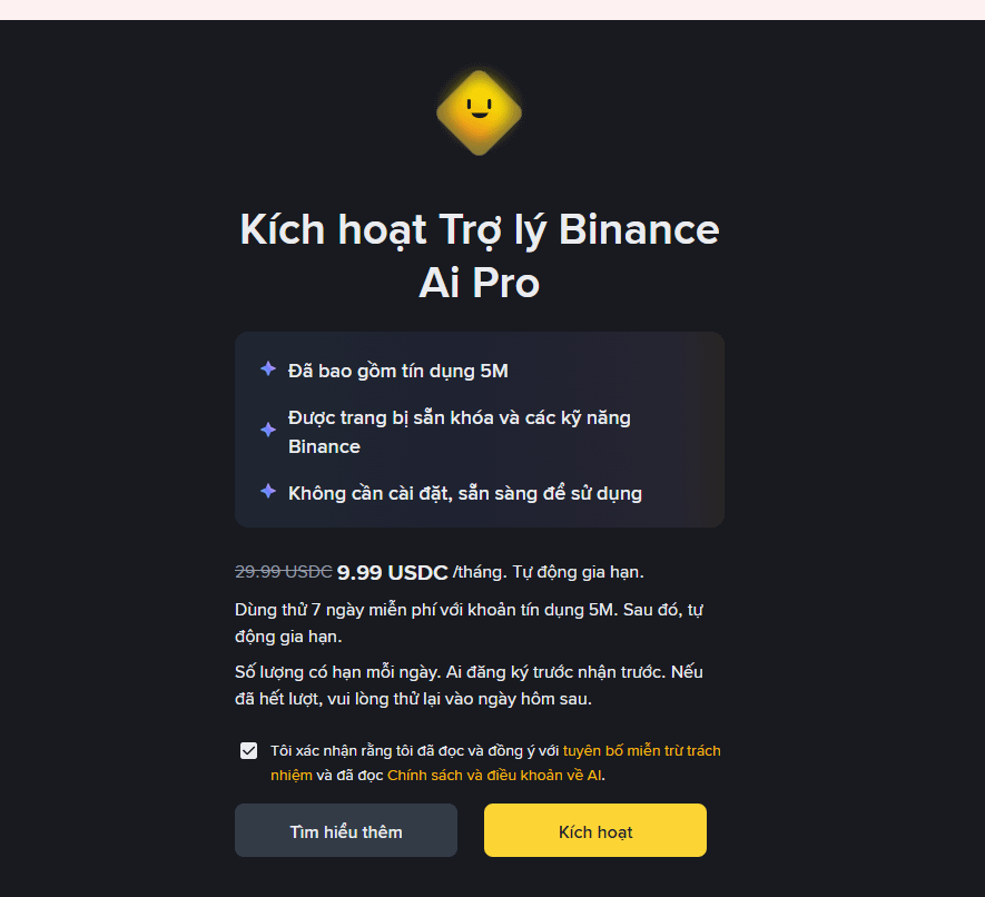Nhấn nút "Kích hoạt" (hiện đang có ưu đãi dùng thử 7 ngày miễn phí hoặc gói thuê bao cực hấp dẫn chỉ 9.99 USDC/tháng).