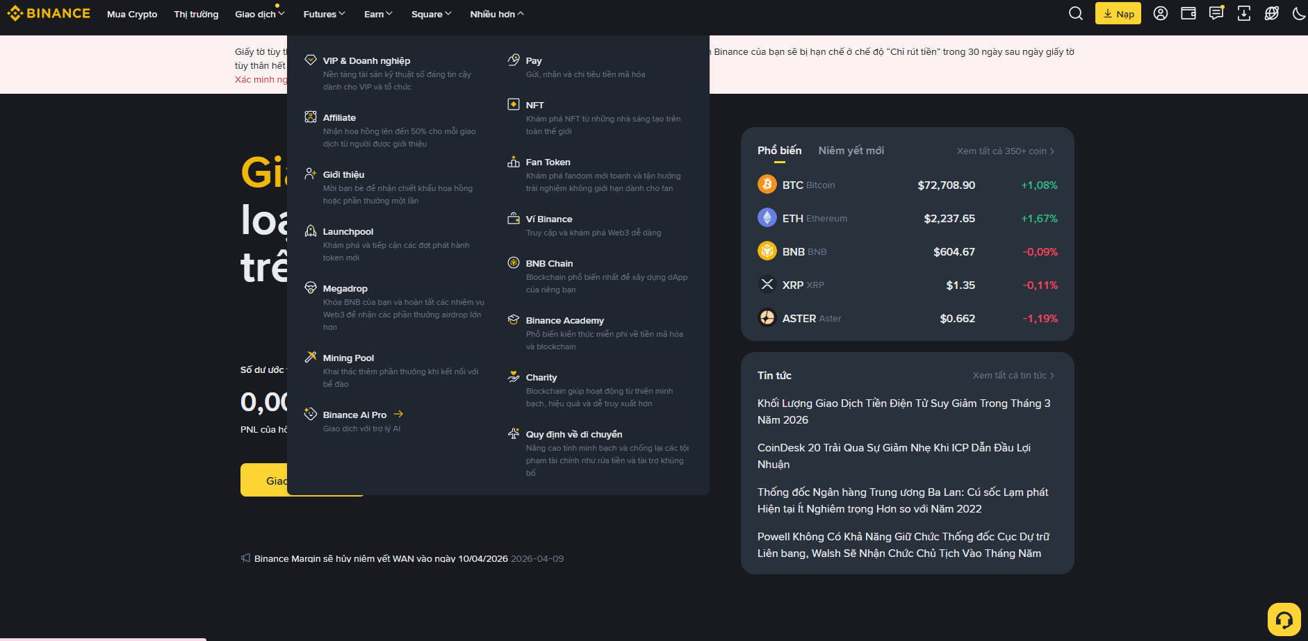 Trên giao diện Web hoặc App Binance, anh em nhấn vào mục "Nhiều hơn" (More) trên thanh menu chính.