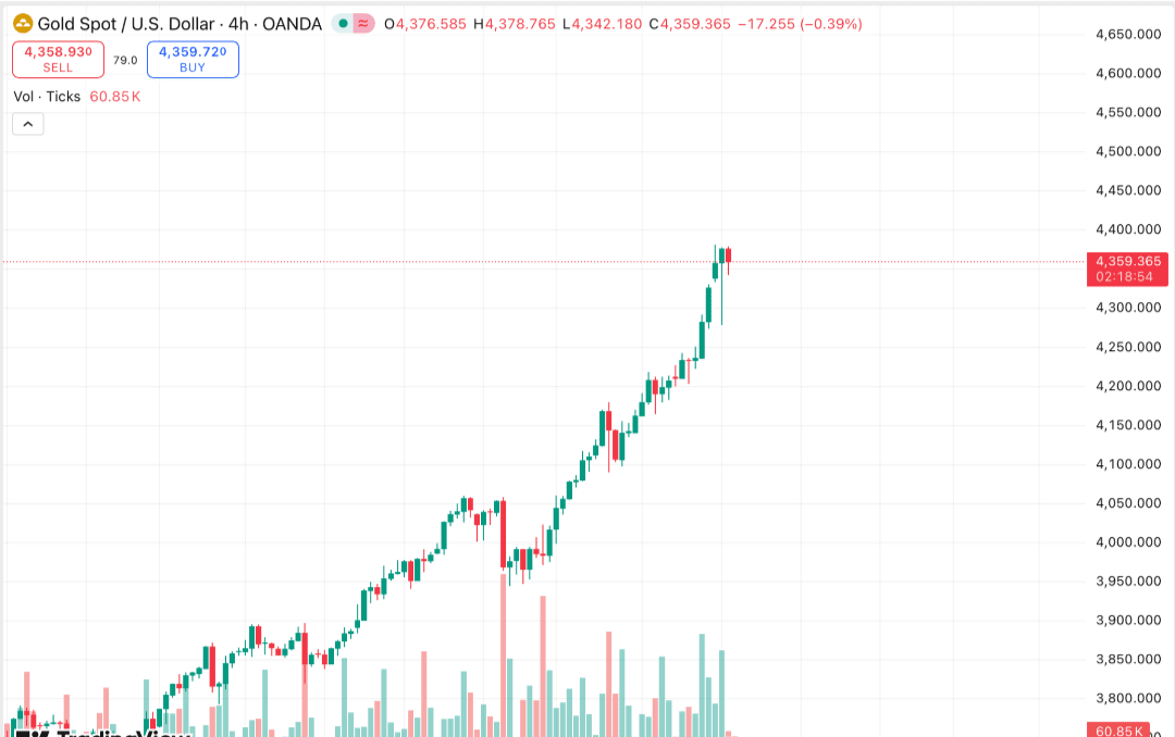 Sejak awal tahun, harga emas telah meningkat lebih dari 60%, yang didorong oleh risiko geopolitik, harapan penurunan agresif suku bunga Federal Reserve (FRS), pembelian massal oleh bank sentral, serta penguatan tren dedolarisasi dan aliran dana ke ETF emas. Pada saat penulisan, emas diperdagangkan pada level sekitar $4360.
