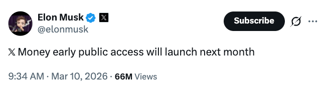 Namun, Musk mengatakan pada bulan Maret bahwa X Money akan diluncurkan pada bulan April.