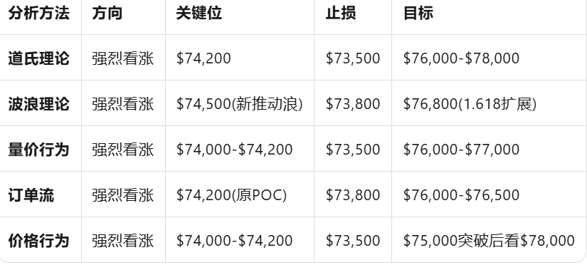 短线判断: 放量突破确认多头重新掌控市场,量能充足支撑进一步上涨,回调至$74,000-$74,200可视为低吸机会