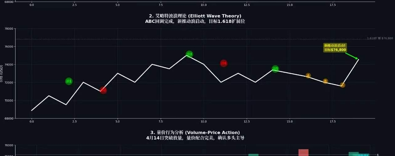 当前状态: 4月14日突破$74,000,确认新推动浪启动,可能是更大级别3浪的开始