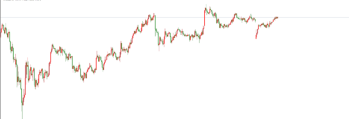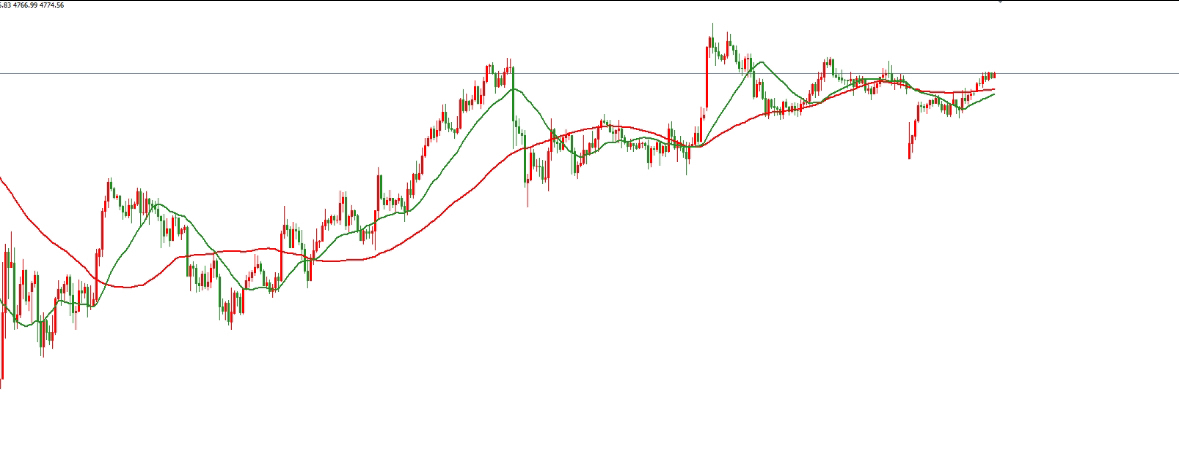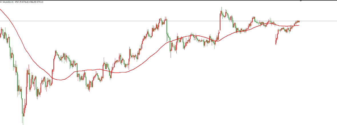 我们来看这个是现货黄金一个小时的走势图,但看图片你很难找到规律,做多还是做空有很大的随机性,一天之中,你可能做多也可能会做空,但是如果我们给走势图加上一根均线效果就不一样了!