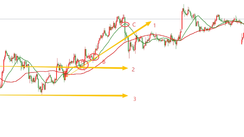 我们再结合支撑压力位来分析一下图标就很容易得出一个交易策略,从图可以看出2和3都是前期重要的位置,2是关键的一个支撑位,A出明显得到了支撑收了大阳线而且这个时候行情在60日均线之上,所以策略就是进场多单,多单可能一般人进场在B处就走了,但是B处认真看行情还是在60日均线之上,而且并没有跌穿20日均线,并且在20日均线处得到了支撑收一根大阳线,之后就是开启强势上涨,直到C处行情跌穿了20日均线并且收了很强的大阴线,这个就是离场的位置。