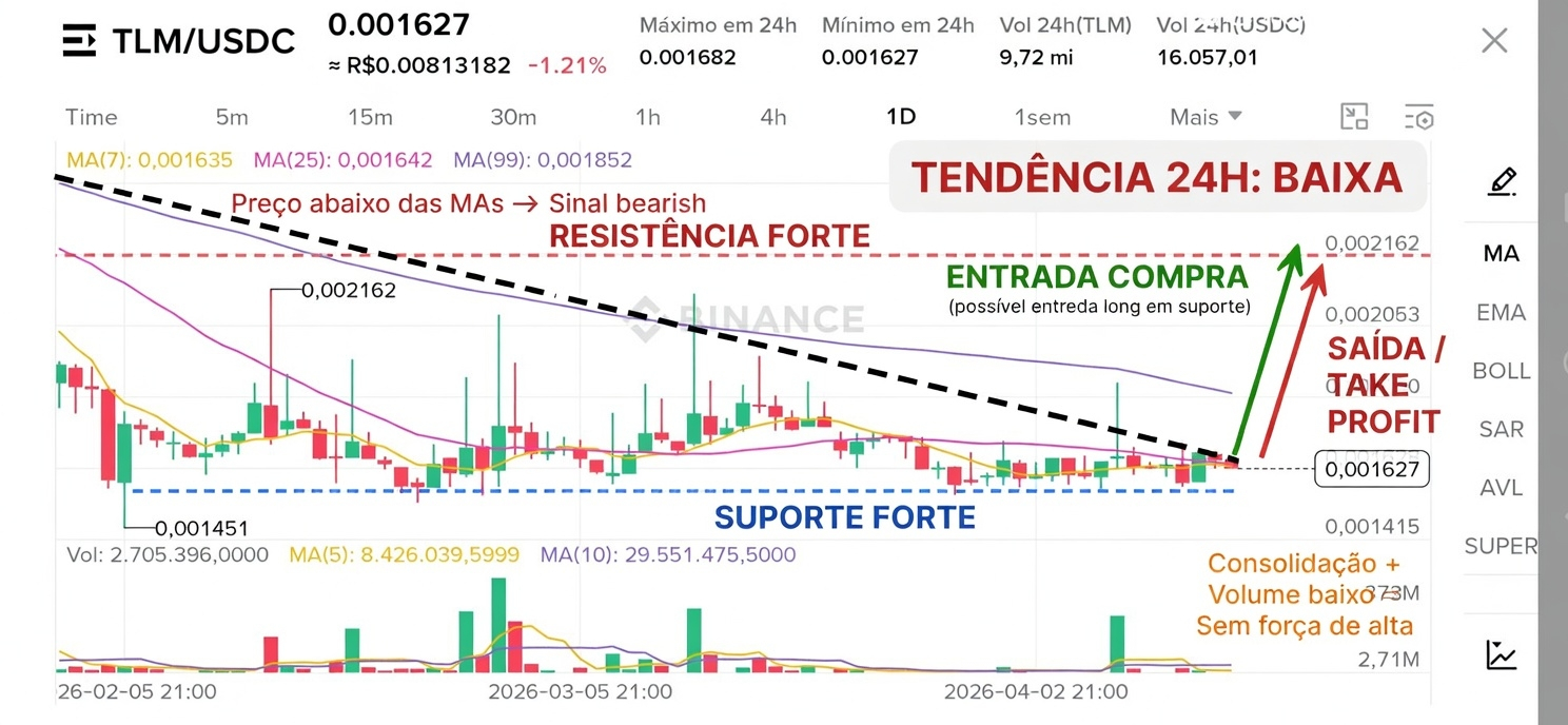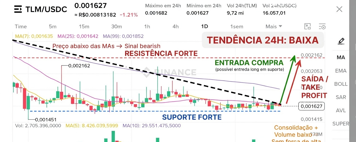 - Volume 24h está relativamente baixo (9,72 mi TLM), sem picos fortes de compra. Os últimos candles mostram consolidação lateral com corpos pequenos e wicks, indicando indecisão + falta de compradores agressivos.