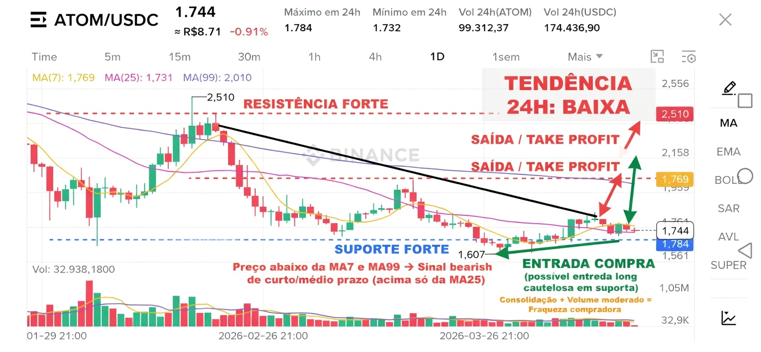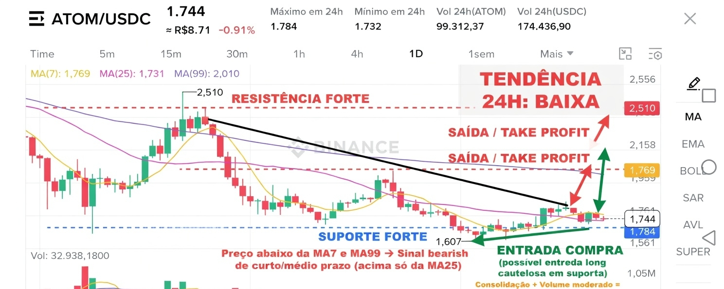 - Melhor setup no momento: Long muito cauteloso no suporte atual (1.732–1.744), com alvo rápido na MA7. Evite posições grandes — o mercado está em tendência descendente de médio prazo e com volume sem convicção.